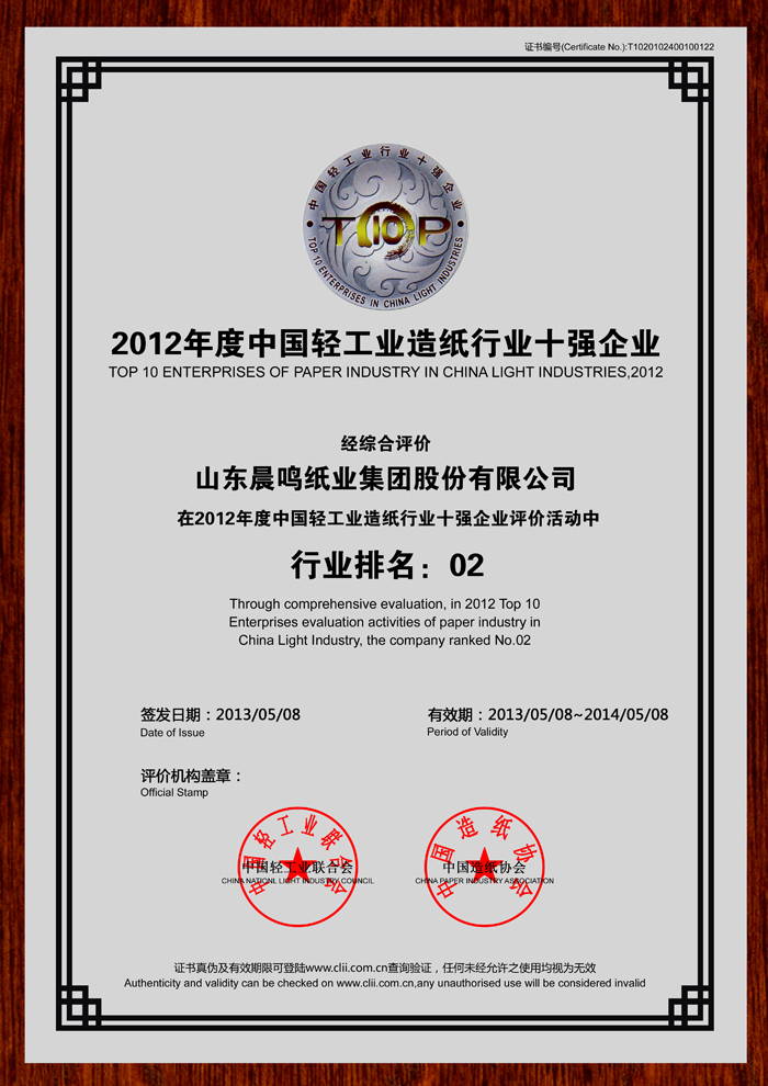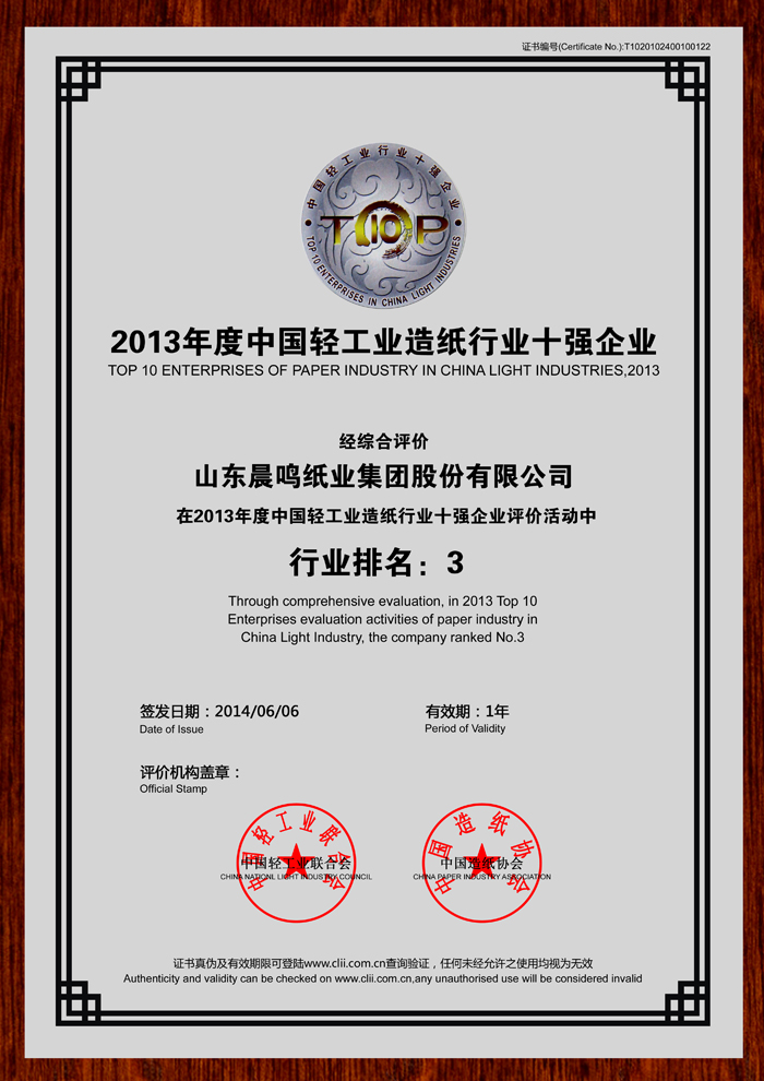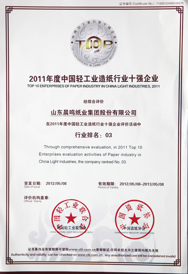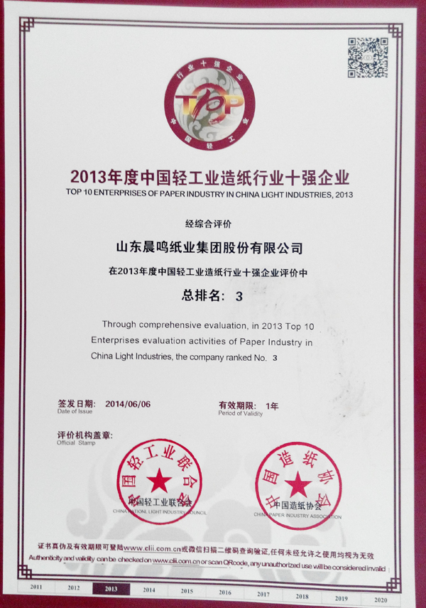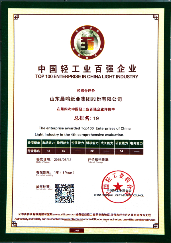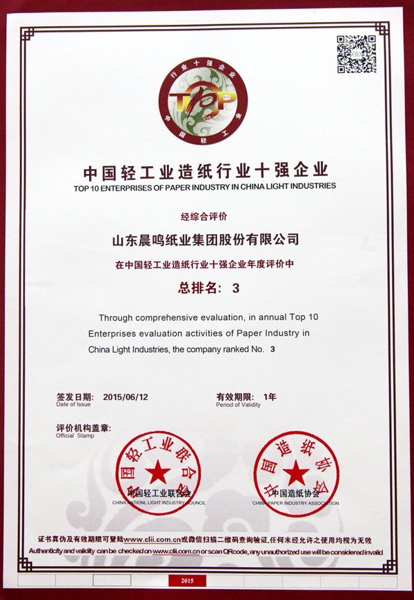 半个多世纪的探索和发展,让晨鸣集团荣誉满冠。晨鸣先后荣获中国企业500强、中国制造业500强、轻工业全国十佳企业、中国出口名牌、全国五一劳动奖状、中国企业管理杰出贡献奖、全国生态文明建设十大新闻人物、全国精神文明建设先进单位、中国造纸工业环境友好企业、中国企业集团纳税五百强、中国工业行业排头兵企业、全国造纸行业劳动关系和谐企业、山东省循环经济示范单位、低碳山东标杆企业等多项荣誉称号。
