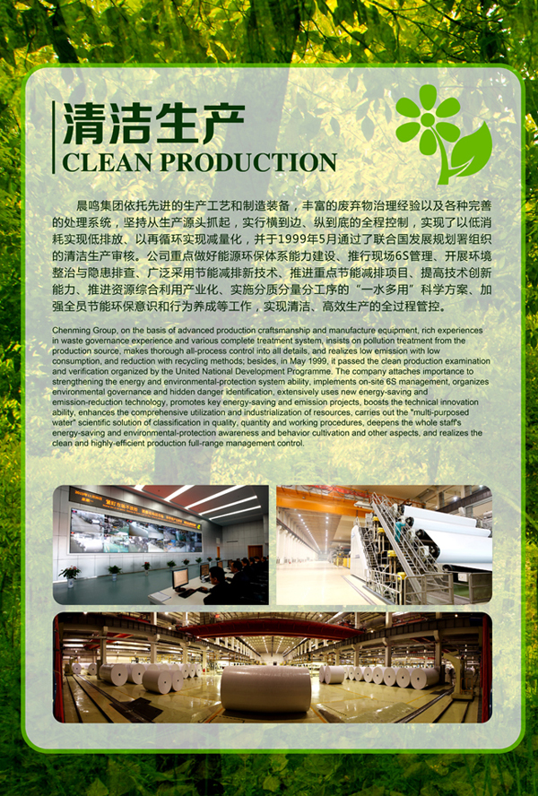 晨鸣集团依托先进的生产工艺和制造装备,丰富的废弃物治理经验以及各种完善的处理系统,坚持从生产源头抓起,实行横到边、纵到底的全程控制,实现了以低消耗实现低排放、以再循环实现减量化,并于1999年5月通过了联合国发展规划署组织的清洁生产审核。公司重点做好能源环保体系能力建设、推行现场6S管理、开展环境整治与隐患排查、广泛采用节能减排新技术、推进重点节能减排项目、提高技术创新能力、推进资源综合利用产业化、实施分质分量分工序的“一水多用”科学方案、加强全员节能环保意识和行为养成等工作,实现清洁、高效生产的全过程管控。