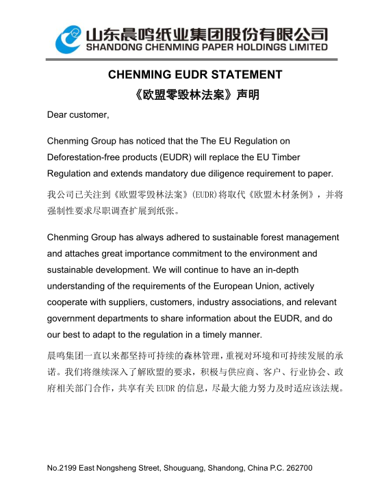 晨鸣集团《欧盟零毁林法案》EUDR声明